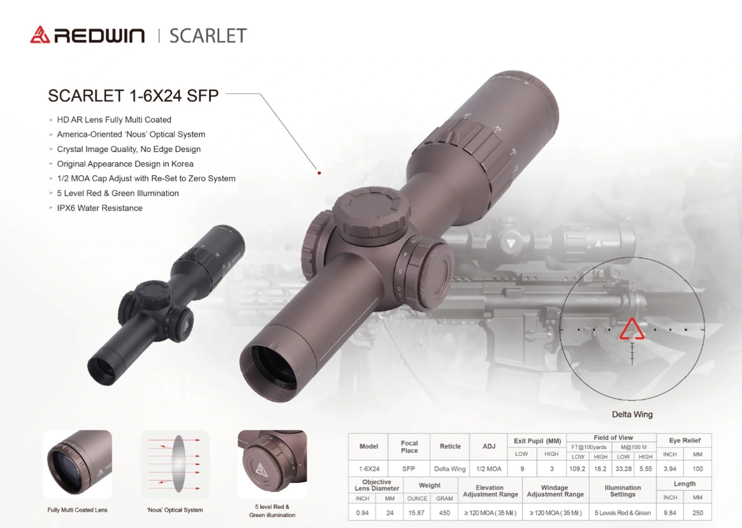 • Soczewka z powłoką antyrefleksyjną o wysokiej rozdzielczości, w pełni wielowarstwowa, zapewnia wyjątkowy obraz. W swej istocie światło jest falą elektromagnetyczną, wśród której fale elektromagnetyczne o długości fali od 400 nm do 780 nm mogą być postrzegane przez ludzkie oko i nazywane są światłem widzialnym. Soczewki lunety Scarlet 1-6×24 SFP przepuszaczają fale o długości od 420 um do 680 um.• Zaawansowany system optyczny "Nous" zapewnia super szerokie pole widzenia. Układ optyczny "Nous" został oryginalnie zaprojektowany w USA. Doskonałe soczewki są w pełni pokryte wielowarstwowymi, szerokopasmowymi powłokami antyrefleksyjnymi, które zapewniają maksymalną transmisję światła i wyjątkową klarowność. Niesamowicie jasny i ostry obraz doda Ci pewności w słabym oświetleniu od świtu do zmierzchu.